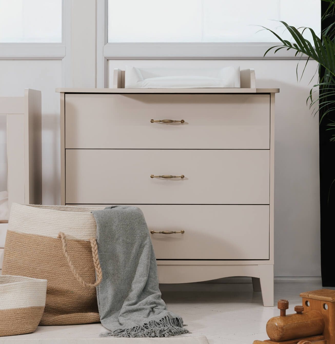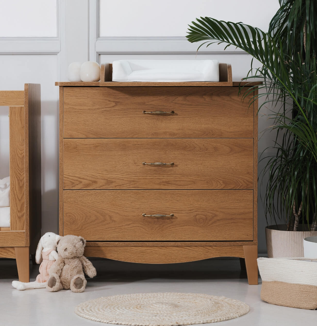 Its delicate, flowing lines bring a light and calming presence to your child’s room, while the refined lacquered finish highlights both character and durability. Designed as a multifunctional piece, it offers a comfortable space for changing your baby as well as ample storage. Three deep drawers provide room for accessories, clothing, and textiles—kept neatly within reach.