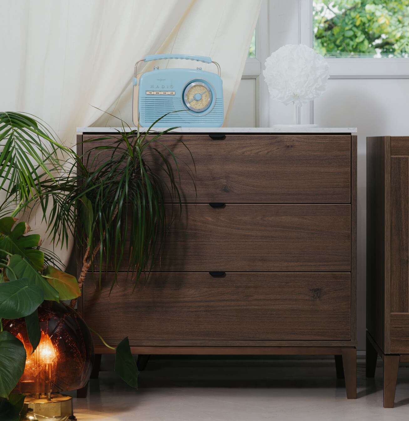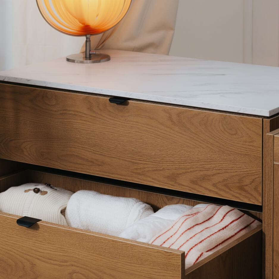 A stone-effect top appears to float above the chest of drawers, complemented by slender, understated handles—creating a timeless and refined aesthetic.